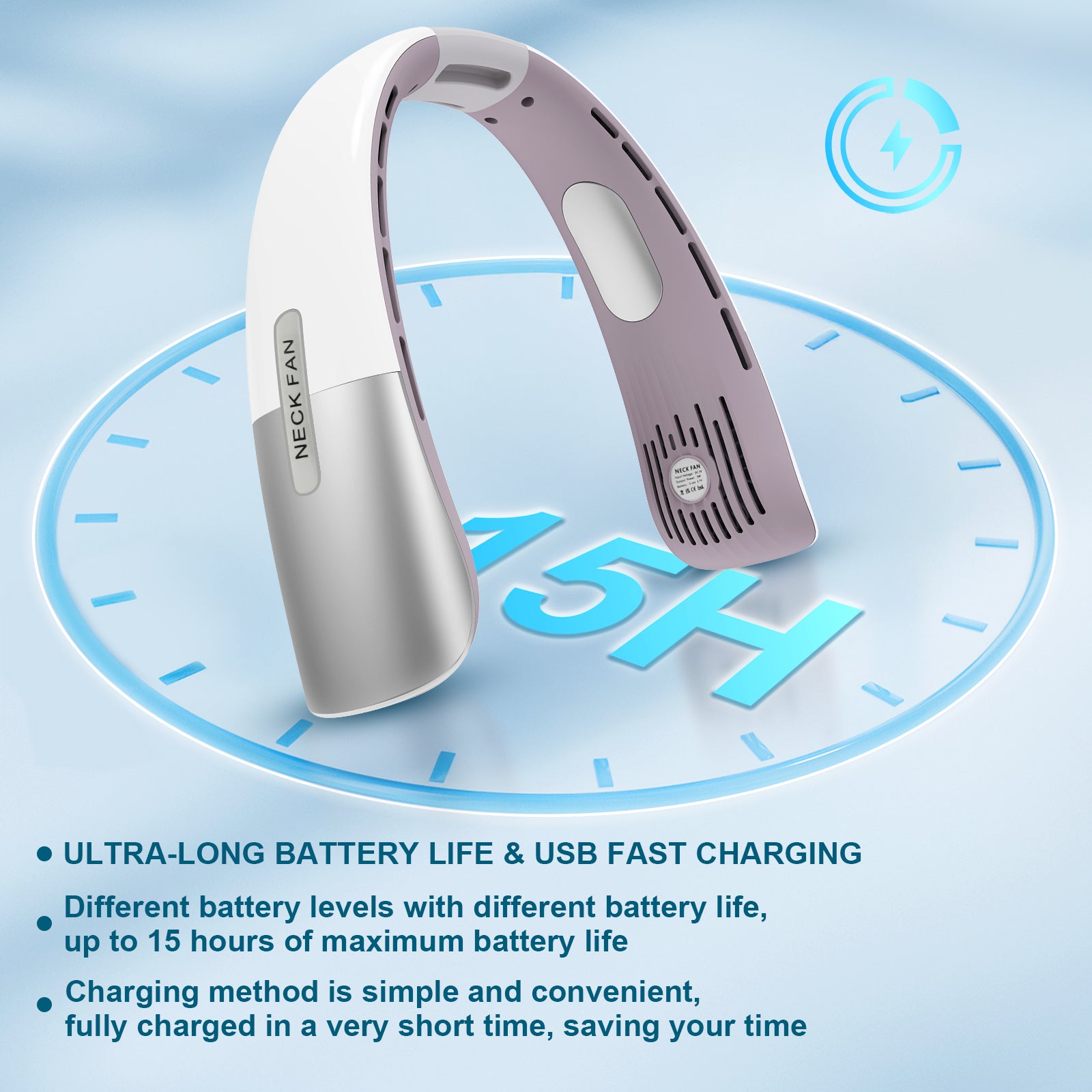 - Large-capacity battery & Fast chargingpersonal neck fan are equipped with a 5000mAH large-capacity battery, which can work continuously for up to 3-15 hours (depending on the speed of different gears). Press the power button of the hands-free fan to adjust the appropriate fan speed to enjoy the coolness. The personal fan charging port is a Type-C interface. The small fan only takes 2 hours to charge to meet daily needs.