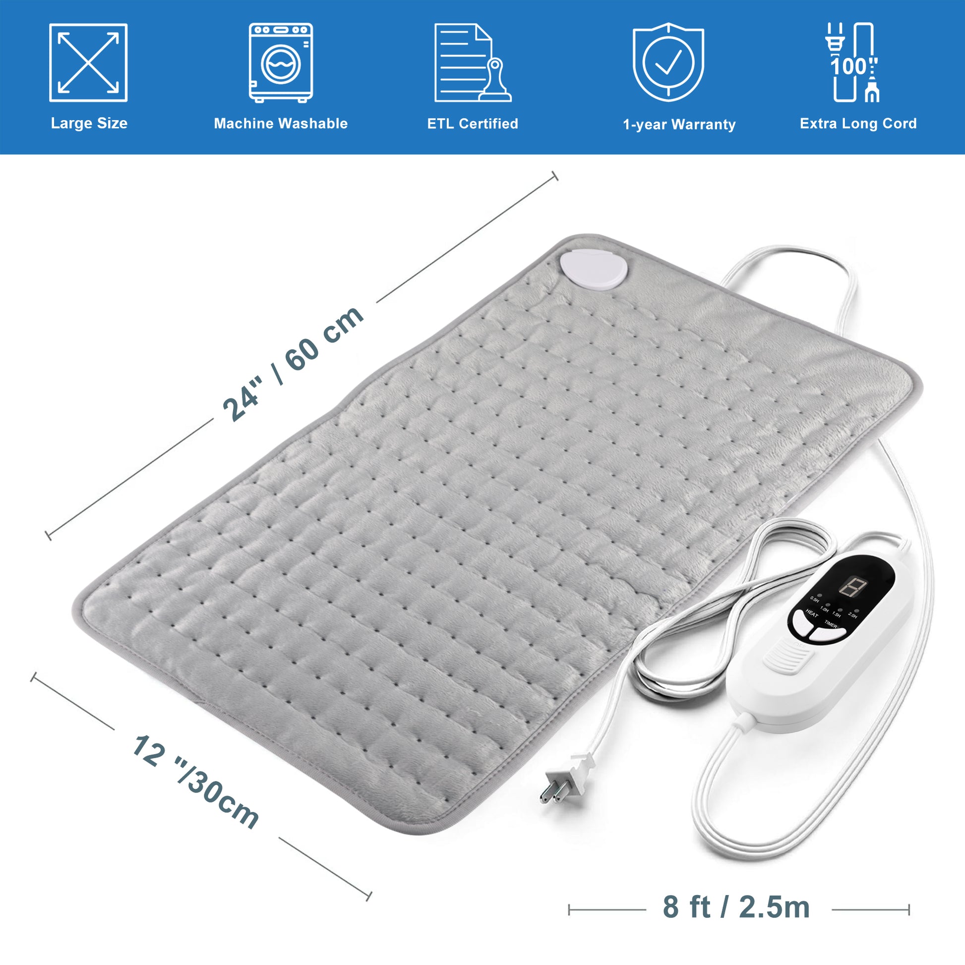 Extra-long 8ft Power Cord - This heating pad comes with a 8ft long power cord, offering superb flexibility. Easily use it around your home or office, free from power outlet constraints.